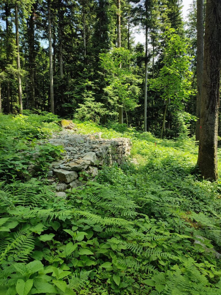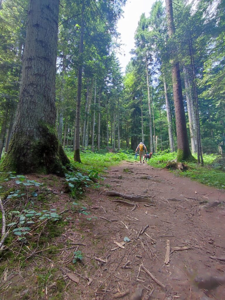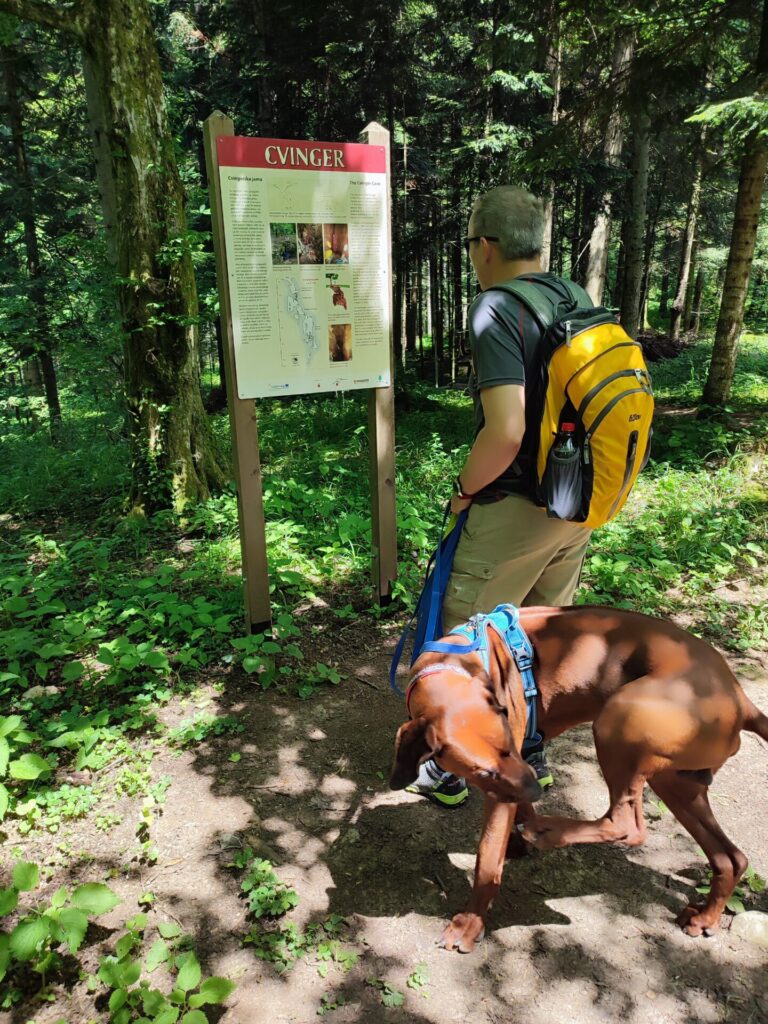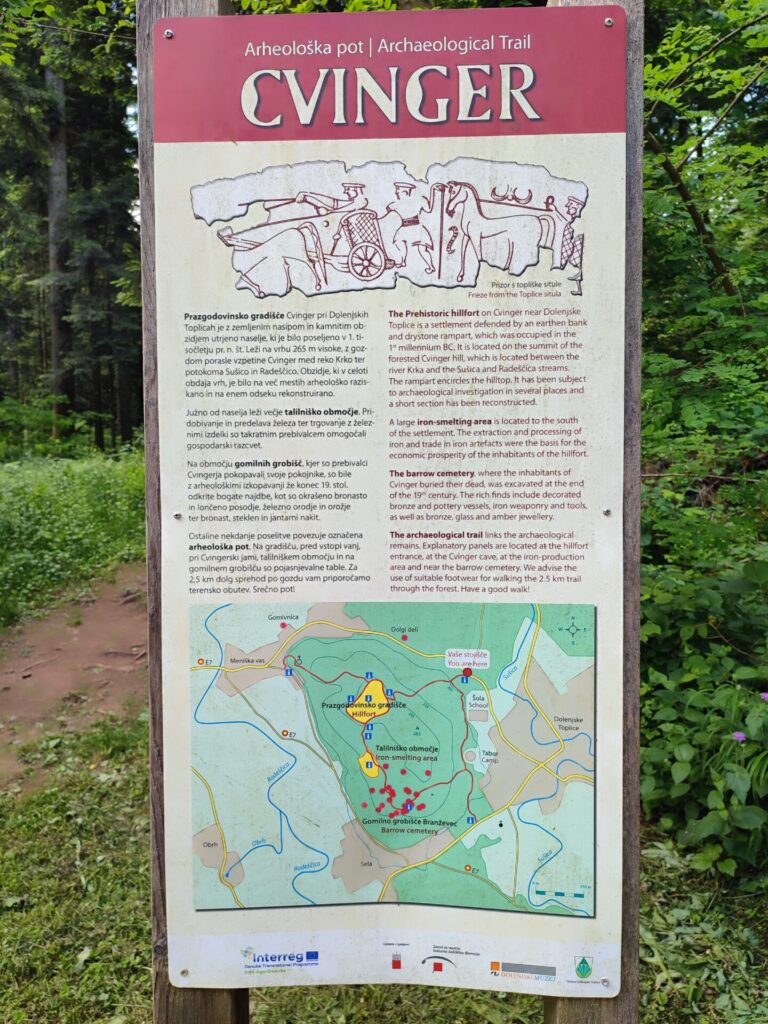 Wetter ist heute super schön und angenehm Warm, wir packen den Rucksack mit genügend Getränken für alle drei und dazu noch ein kleiner Zwipf. Zusätzlich noch ein Regenschirm, Sackmesser (man(N) weiss ja nie). Um 11:30 Uhr geht es los und wir laufen los von unserem Camping. Der erste Streckenteil führt uns an dem kleinen Fluss entlang wo Rio bereits gestern getaucht ist. Nach ca. einer halben Stunde geht es dann langsam den Hogger hinauf Richtung der «Befestigten Höhensiedlung Cvinger». Der auf Waldpfaden verlaufende Weg ist mit Hinweisschildern am Ausgangspunkt und den interessanten Plätzen gekennzeichnet: an der Siedlungsanlage, an den Eisenschmelzstätten und an den Hügelgräbern. Der Wanderweg auf den Cvinger (256 m) ist nicht schwierig.