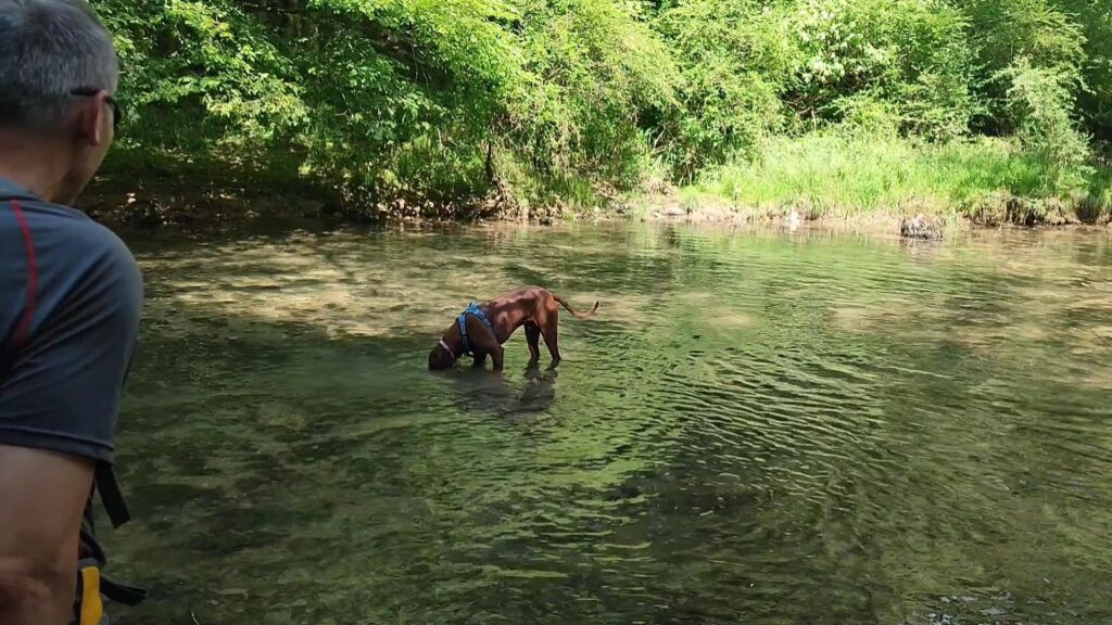 Bevor wir dann wieder aufgebrochen sind haben wir uns noch ein Glace gekauft welche wir dann auf dem Rückweg verputzt haben. Am Fluss durfte Rio nochmals baden gehen, juhu wir haben ein Rhodesian Ridgeback der Wasser liebt! Also haben wir nochmals Stöckli geworfen welche nicht schwimmen ……… hi hi hi mit der Absicht das Rio danach taucht und siehe da Er taucht!!!! Danach sind wir zurück auf den Camping gewandert und waren ganz erstaunt das dieser fast komplett voll ist.