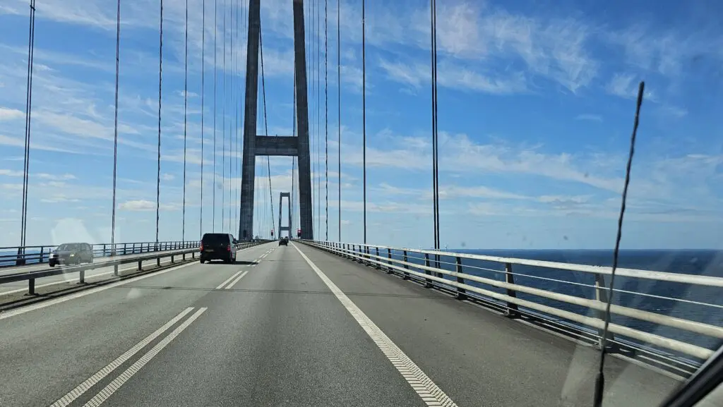 Wir fahren heute auf einen Campingplatz auf der Insel Fyn (Fünen), welcher eher abgelegen ist. Darum decken wir uns mit dem Nötigsten ein, damit wir selber kochen können. Nach einer Stunde kommen wir bei der Storebælt Brücke an. Die Überfahrt kostet DKK 635 (CHF 80), es lohnt sich aber – die Aussicht ist super, die Brücke ist ca. 6.8 km lang.