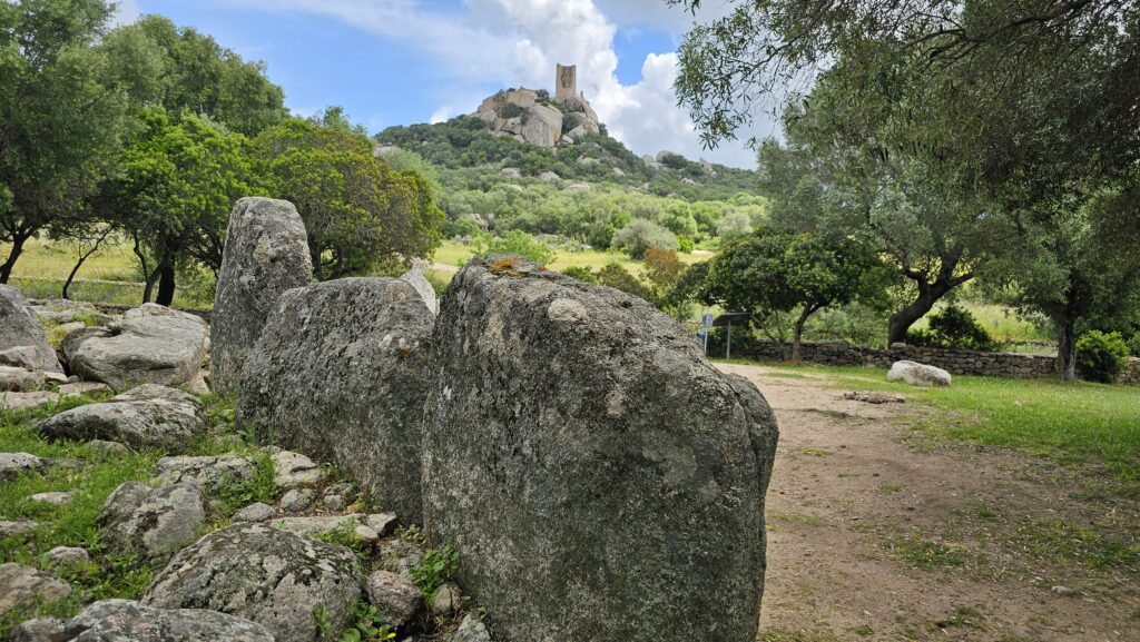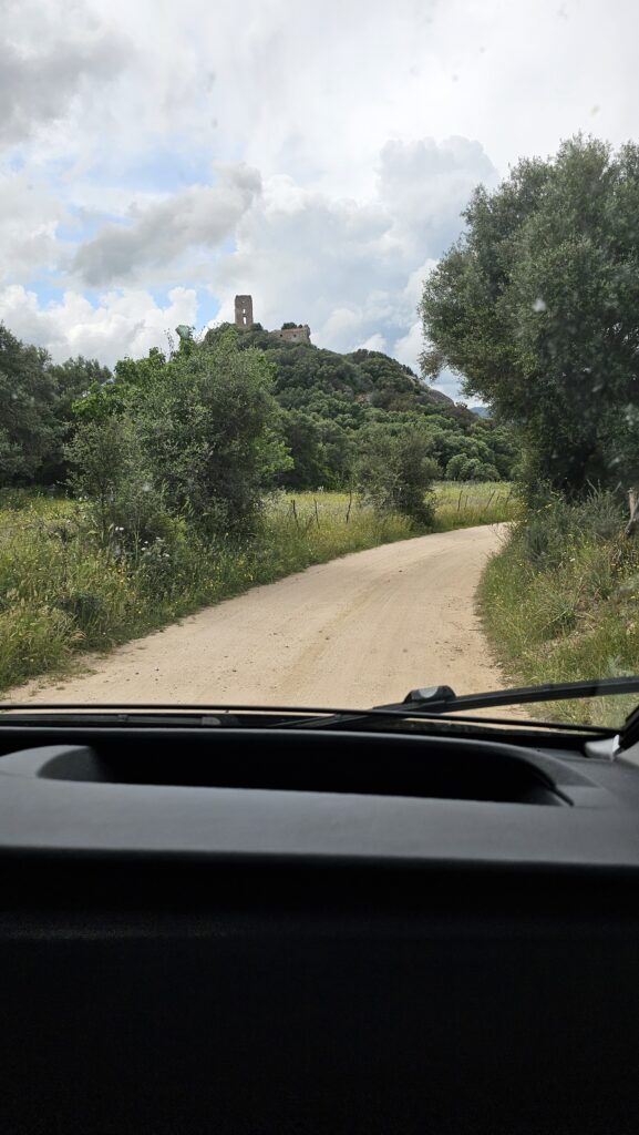 28.4.25: Gestern konnten wir nicht duschen, weil nur eiskaltes Wasser kam. Darum sind wir froh, dass heute Morgen die Duschen wieder funktionieren. Meine Mückenstiche in beiden Fersen haben mich letzte Nacht auf Trab gehalten… Um elf fahren wir los in Richtung Olbia, wo unsere Fähre am Abend um 22 Uhr auslaufen wird. Wir haben eine Ruine ausgesucht «Castello di Pedres», welche wir vorher besuchen wollen. Die Zufahrt versetzt uns leicht in Panik, weil wir uns auf dem Flughafen-Areal befinden und uns die Polizei am rechten Strassenrand komisch begutachtet. Wir haben Glück es ist eine offizielle Strasse, nicht wieder ein Problem mit GoogleMaps («schnellste Route» sollte man immer überprüfen). Die Strasse ist schnell nur noch Schotterstrasse und sehr schmal mit tiefen Löchern. Ein Auto kommt uns entgegen, kreuzen eher schwierig. Es kommt uns ein Camper-Kastenwagen entgegen – es reicht grad so. Als wir hinten am Parkplatz ankommen sind bereits zwei grosse Camper parkiert und auch ein paar Autos. Wir laufen zur Ruine hoch, nur ca. 15 Minuten, dann sind wir oben – wow, wirklich schöne Aussicht. Wieder unten gehen wir spazieren.