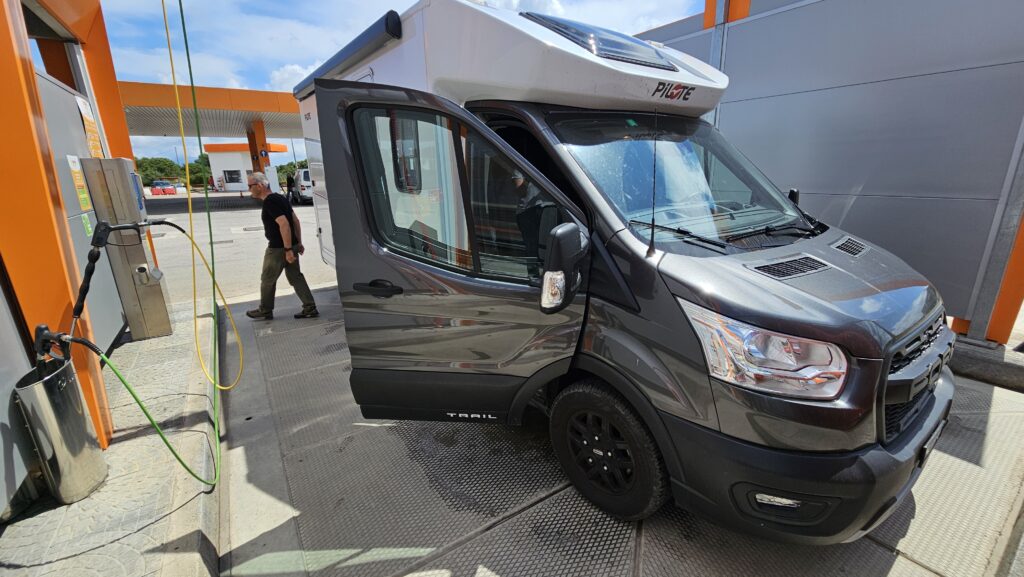 Beim Wegfahren kommt uns ein deutscher VW-California entgegen – an einer so doofen Stelle, er muss ziemlich viel rückwärts fahren, es dauert einige Zeit, bis wir weiter fahren können. Zurück in Olbia fahren wir zum Aldi Brot holen und fahren zur Waschstation.
