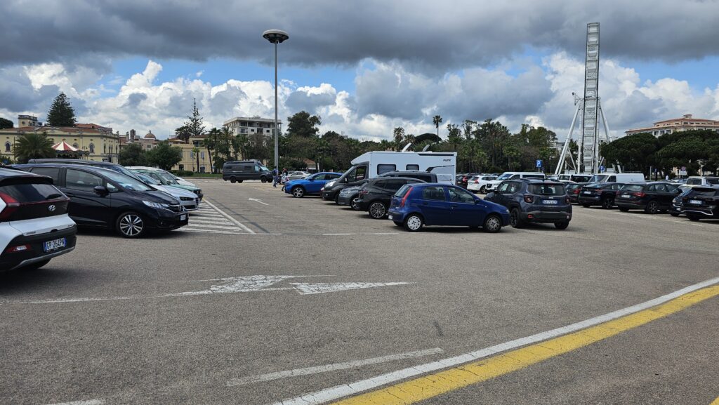 Danach fahren wir zum Hafen, es hat dort gratis Parkplätze. Wir staunen, was das Volk unter parkieren versteht. Kreuz und quer, auf der Ausfahrspur, auf den Car-/Taxi-/Mutter-Kind-Parkplätzen stehen lauter kleine kaputte Fahrzeuge mit italienischen Nummern. Wir haben Glück, nach fünf Minuten sehen wir jemand weg fahren.