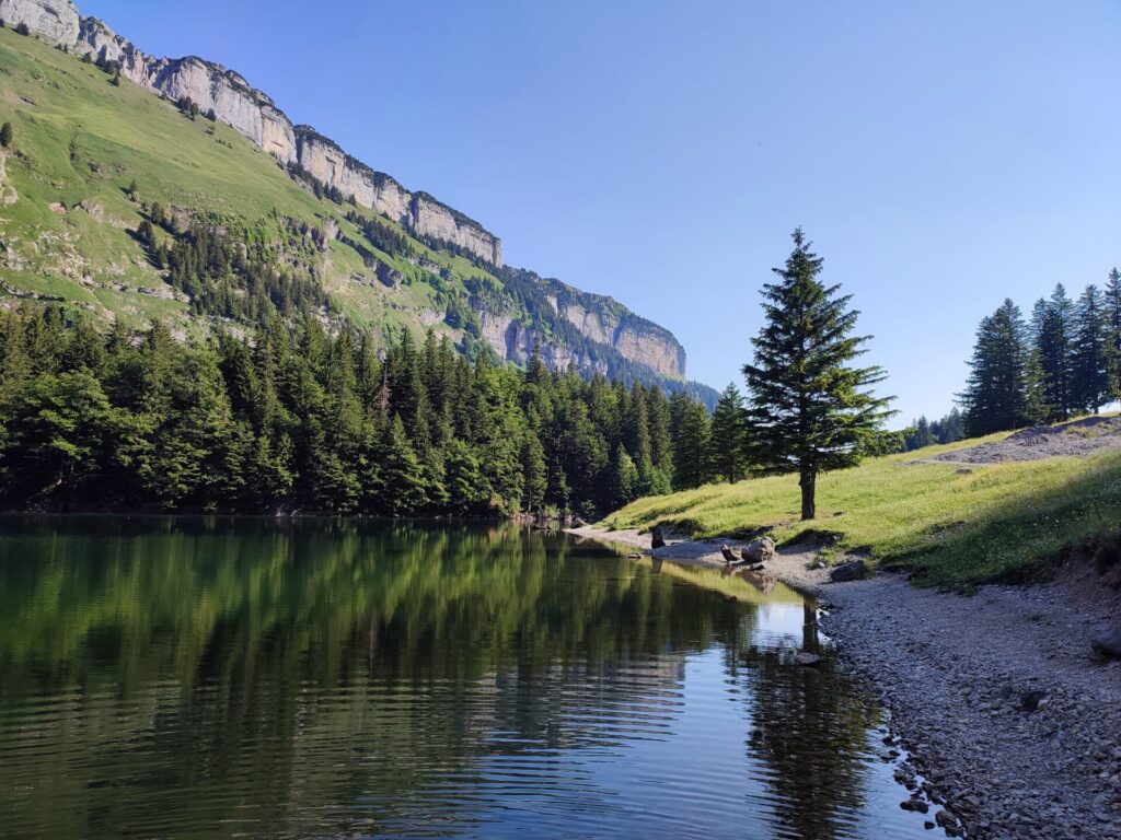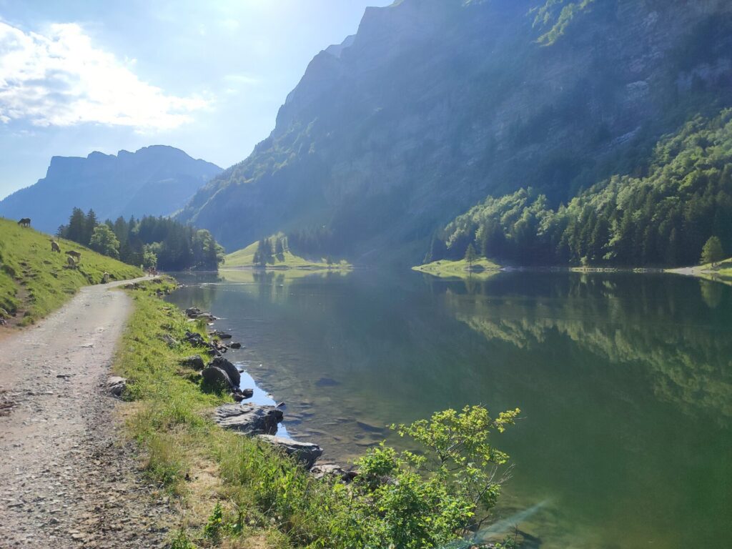 Die Nacht ist sehr ruhig, die Temperaturen ziemlich zurückgegangen – ich krame wieder mein Schlafsack aus dem Schrank, damit ich nicht friere. Um halb acht machen wir uns auf zum Seealpsee. Dafür nehmen wir den geteerten Weg bis zum See, wir kommen ziemlich ins Schnaufen es geht steil nach oben. Nach 50 Minuten weden wir belohnt, der See sieht am Vormittag toll aus.