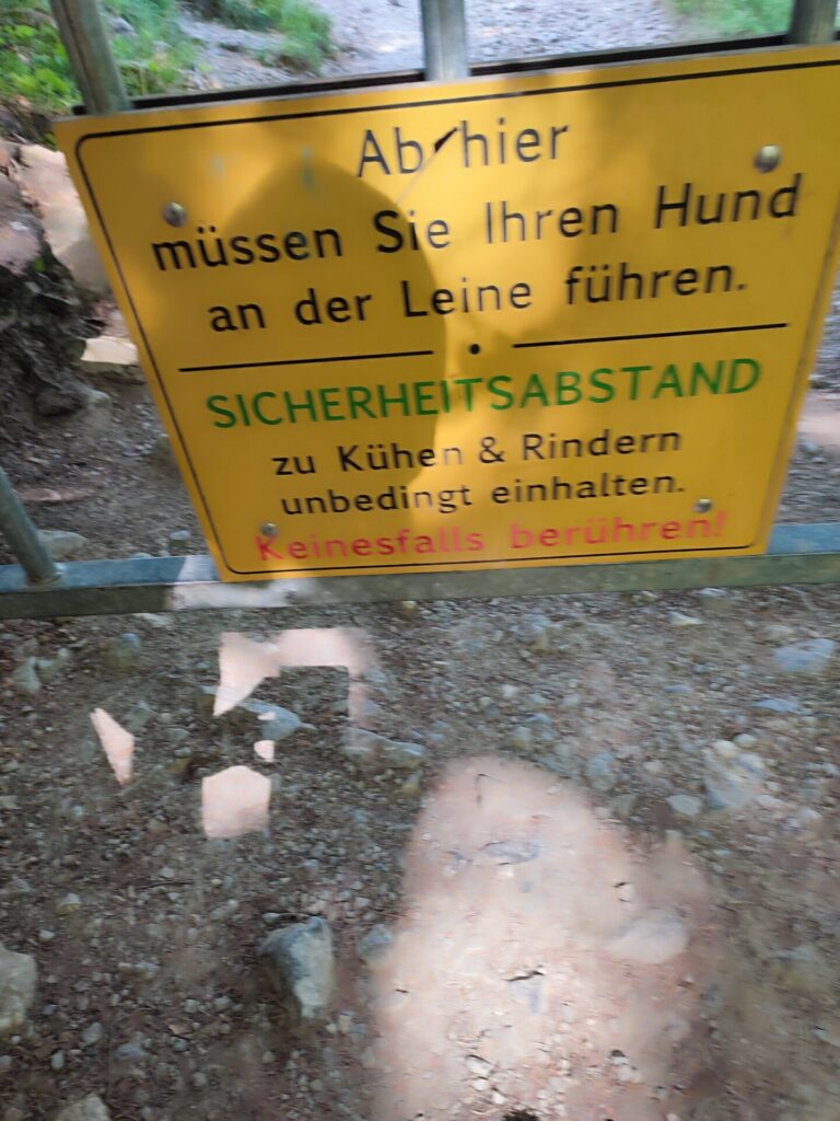 Dieses Schild kommt, als ich bereits durch ganz viele Kühe gelaufen bin und Rio natürlich immer an der Leine hatte 🤭.