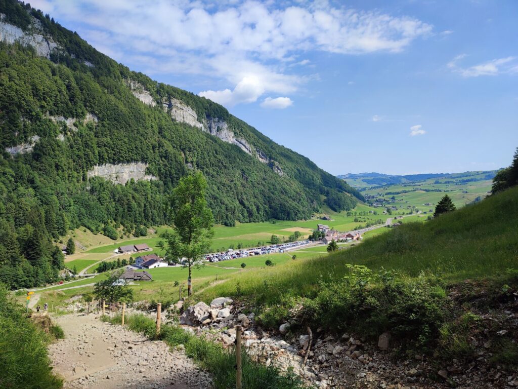Für den Rückweg nehmen wir den Wanderweg auf der anderen Seite. Er führt durch gefühlt hundert Kuhweiden, Rio hat sich schnell an die Tiere gewöhnt. Unterwegs will ich Alpkäse kaufen, drehe aber wiede um als ich sehe, dass die Hühner frei herum laufen (Rio hätte seine Freude gehabt). Der Abstieg ist wieder sehr steil. Unterwegs mache ich noch ein Foto vom Parkplatz, er sieht wieder voll aus.