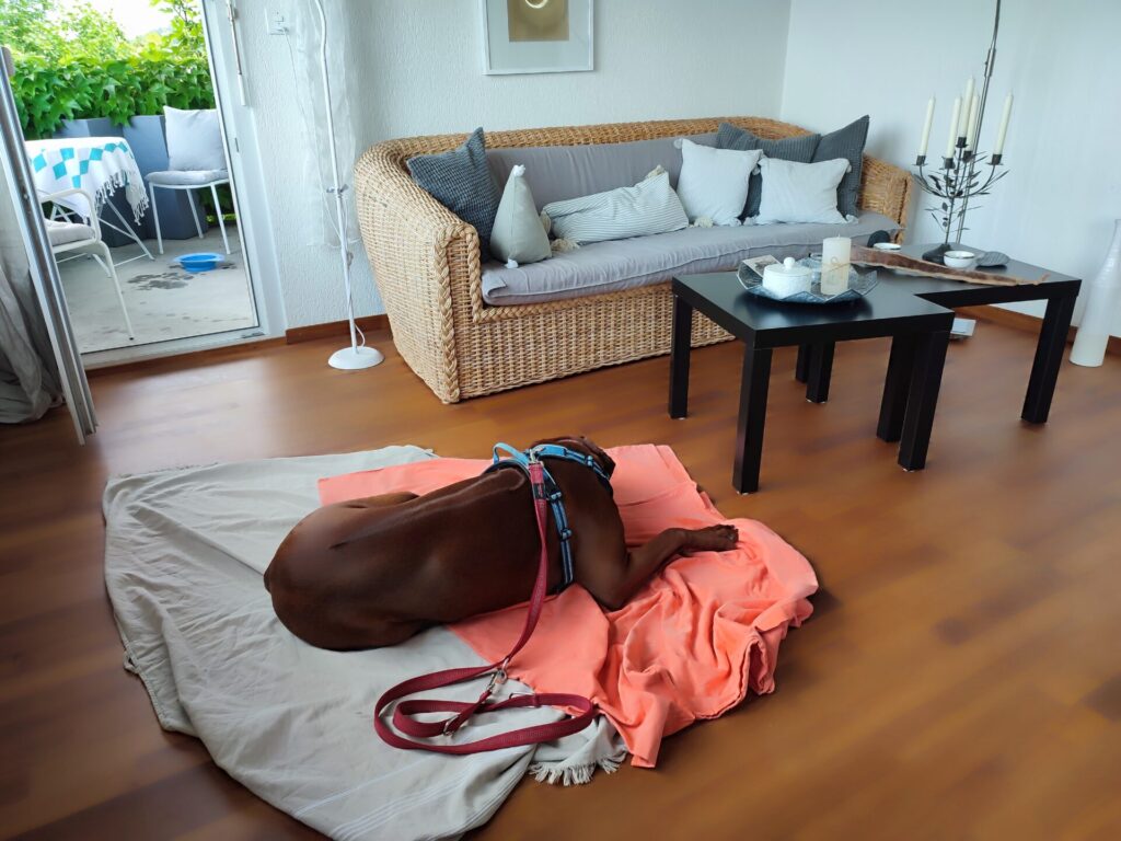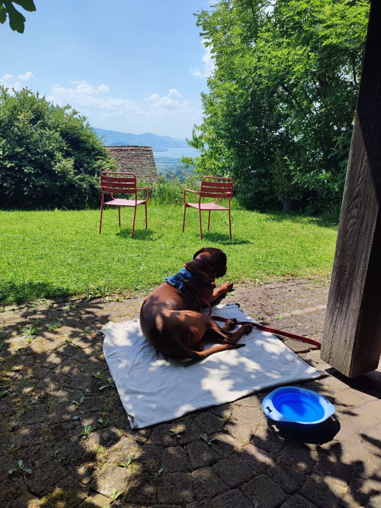 Rio legt sich gleich hin, er ist noch müde von der Wanderung. Es gibt Salat und Spätzli mit Ofengemüse, herrlich! Für den Kaffee setzen wir uns in den Garten, was für eine Sicht auf den Zürisee!