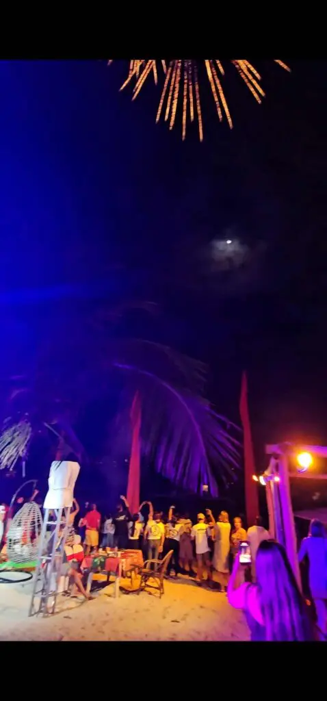 31.12.25: gestern ging es mir nicht viel besser, ich nehme Entzündungsmittel – meine Backe wird besser, dafür die Füsse schlimmer. Heute nehme ich mir aber vor, trotzdem unterwegs zu sein. Am Nachmittag kaufe ich mir eine Schnorchelbrille und T-Shirt. Gegen Abend sind wir bei Ate Dish eingeladen, sie hat Geburtstag. Das Essen ist herrlich, es gibt sogar Salat (mit Apfel drin und French-Dressing), wir können es fast nicht glauben – wie einem sowas in dieser Art fehlen kann…. Danach laufen wir ins Maldito Resort, dort gibt es Live-Musik und danach Schaum-Party hihi. Da wir am nächsten Tag bereits um 7 Uhr aufs Schiff müssen, gehen wir um ein Uhr zurück.
