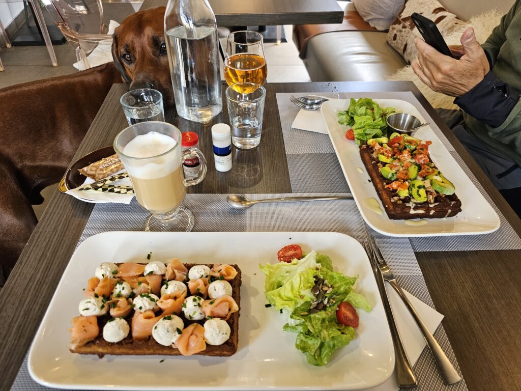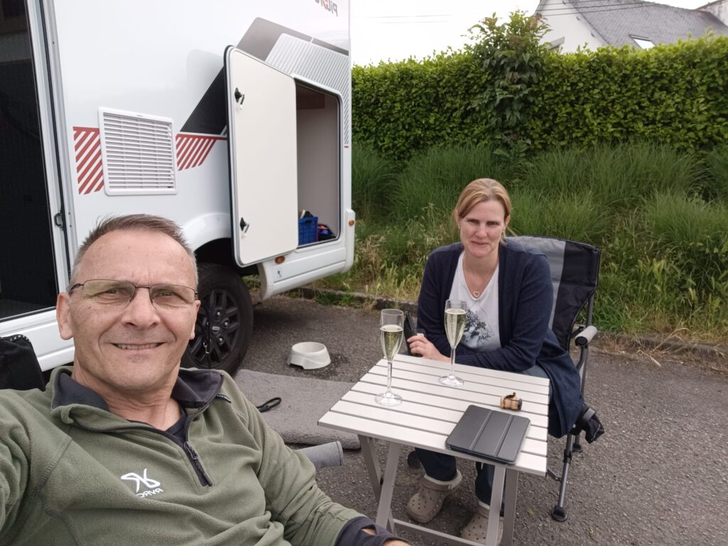 Weiter gehts über Lannion über Land (gemäss Navi ohne Autobahn) was eine grosse Herausforderung wird, die Strasse ist teils sehr schmal und immer wieder kommen LKWs und Camper entgegen, das Kreuzen ist schwierig. Irgendwann sind wir so weit auf dem Land unterwegs, dass niemand mehr zu sehen ist. Das Wetter macht toll mit, wir sehen eine Landschaft, die sehr eindrücklich ist. Irgendwann kommen wir in Port-Arven an. Nachdem wir uns endlich beim Air Camping Car Park registriert haben (ich schwöre, ich hatte zehn Minuten, bis ich an einem Automaten die Einlasskarte gelöst hatte: -> wählen Sie die Sprache -> sind Sie Kunde oder wollen sie sich neu registrieren -> wollen Sie die Karte mit Geld laden oder pro Nacht bezahlen -> wie viele Nächte? -> wählen Sie ihr Land (Swazieland, Sweden konnte ich anwählen, Switzerland erst im dritten Anlauf, die Tasten waren so träge und ich immer zu schnell mit drücken) -> geben Sie Ihre Telefonnummer für Notfälle an -> PLZ -> Kennzeichen Ihres Fahrzeugs -> Vorname, Nachname, Mailadresse -> bestätigen, dass sie die Daten verwenden dürfen -> bitte warten -> Kartenzahlung , PIN eingeben -> bitte warten -> Ihre Karte wird gedruckt -> bitte warten…………….. ich dachte schon, verstehen Sie Spass kommt gleich mit der Kamera um die Ecke ;-). Da wir heute Hochzeitstag haben, gehen wir in die hübsche Altstadt etwas leckeres Essen. Salzige Waffeln mit üppigem Belag, herrlich. Wir laufen noch zum Intermarché hoch und holen uns das Nötigste an Esswaren. Wieder zurück bei Ugur, stossen wir mit einem Gläschen Sekt an. Euch einen schönen Abend.
