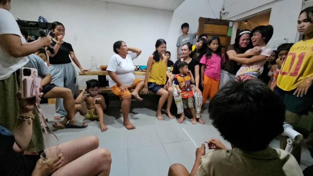 25.12.25: ich wache zu früh auf, bereits nach nur drei Stunden Schlaf. Es wird schon hell und drückig, stelle die Klimaanlage etwas kälter ein. Dafür nehme ich das Notebook und schreibe die Blogs fertig, in Malapascua hatte ich zu wenig Zeit und schlechtes WLAN. Irgendwann schreibt meine Schwägerin, dass ihr Bruder unterwegs ist um und ihr Motorbike zu überlassen, damit Yvi und ich selber los können. Oje, ich (ohne Essen, Kaffee, Dusche und zu wenig Schlaf) hurti angezogen und dann bei Yvi geklopft, damit sie mir hilft. Wir sind beide noch nie Motorrad gefahren. Im kleinen Hof vor der Pension üben wir etwas, scheitern jedoch kopfschüttelnd. Wir fühlen uns nicht in der Lage, zu zweit alleine unterwegs zu sein. Wir holen uns zu Fuss im selben Laden wie gestern noch genügen Wasser. Später beichten wir May, dass wir nicht fahren werden. Sie holen uns mit einem zweiten Motorbike ab und fahren uns viel sicherer als wir das je geschafft hätten, umher. Zuerst halten wir am Grab von Mays Papa, er ist vor einem Monat gestorben. Die ganze Familie hat sich dort wieder getroffen. Danach fahren wir in ein nobles Resort (nur wir vier und die zwei Kinder von May) um dort zu Essen. Mal etwas ganz ausgefallenes für mich: Spaghetti Pomodoro (fast die einzige Speise ohne Fleisch) aber super lecker. Als Vegetarier kommst du auf den Philippinen nicht weit. Am Abend holt uns Franklin ab und bringt uns wieder nach Park Homes. Dieses Mal sind ganz viele Leute dort, erweiterte Verwandtschaft und wer kein Zuhause hat. Sie machen die gleichen Spiele, wie wir am Vorabend gemacht haben. Sie sind alle sehr glücklich und überdreht, freuen sich über alles. Klar ist auch ein wenig Alkohol mitschuldig. Wir gehen bereits früh wieder zurück, wir werden wieder chauffiert. Als «normaler» Tourist würde man das nie miterleben.