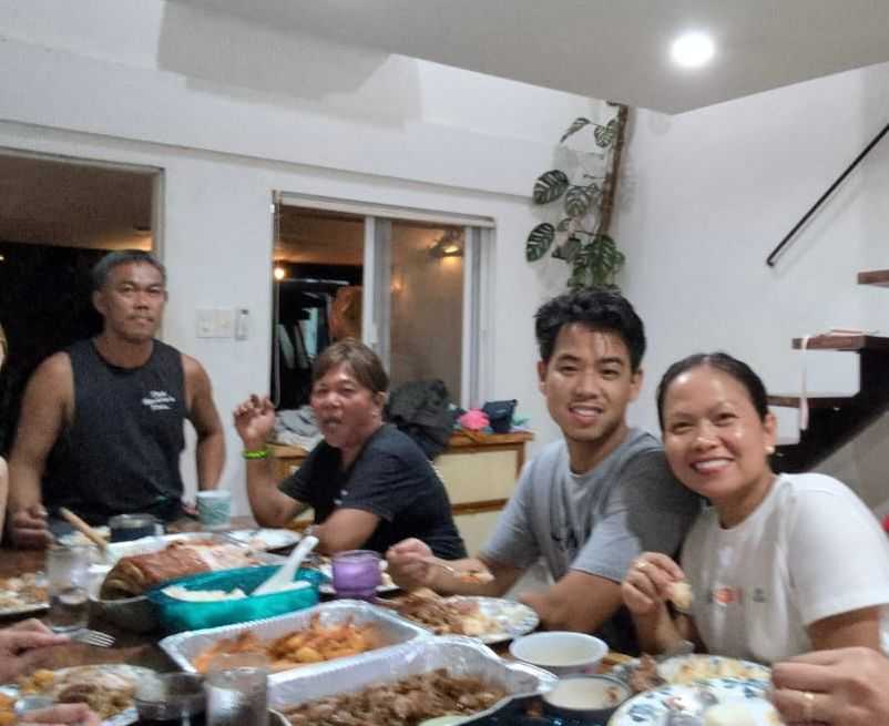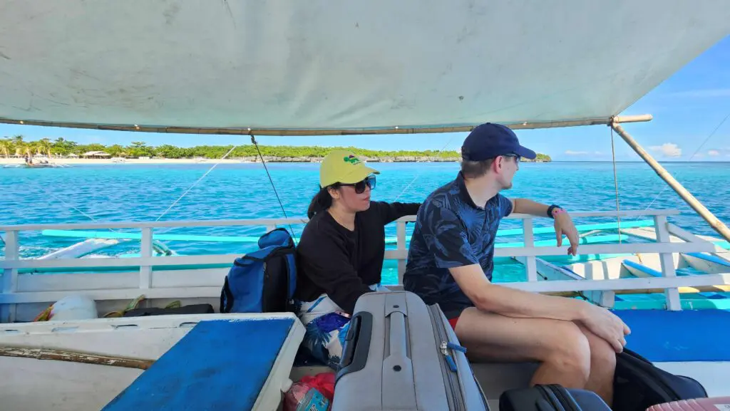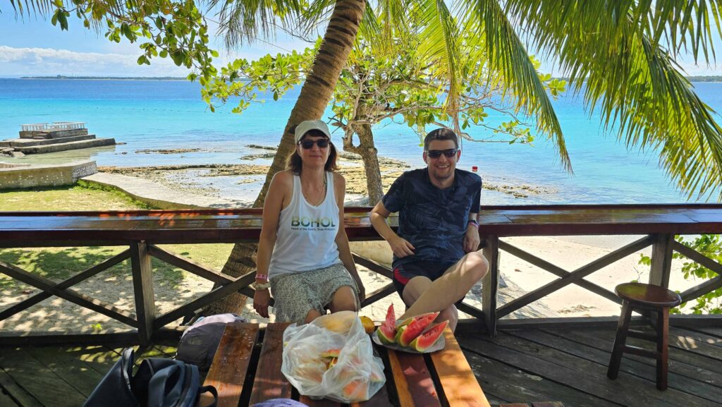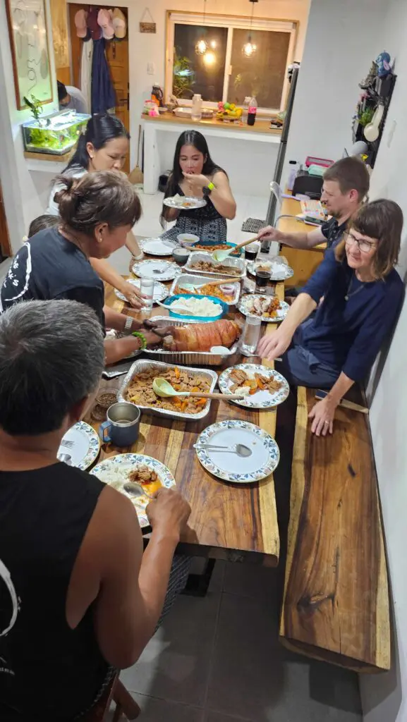 24.12.25: wir starten heute bereits um 7.30 Uhr, weil wir noch die «Virgin Island» besuchen wollen. Mit dem Boot dauert einen Weg 3h. Der Bruder von May (Franklin) bringt uns hin. Die Mühe lohnt sich, es ist wunderschön hier. Weisser Sand, schöne Plätze am Schatten sich auszuruhen oder essen. Man muss allerdings «Eintritt» bezahlen. Zusätzlich schliessen sie bereits um 13 Uhr, weil Weihnacht ist. So bleiben uns 1.5h zum Essen und rumlaufen, das reicht aus. Dann starten wir bereits wieder die Rückreise nach Maya, die Wellen sind etwas höher, gefällt mir besser weil auch die Luft besser ist. Habe bei der Hinreise gefühlt eine Kohlenmonoxid-Vergiftung eingefangen, sobald der Wind falsch wehte ;-). Auch der Lärmpegel vom Motor ist hoch. Zurück in Maya sehen wir uns den Geburtsort von May an, kaum zu glauben wie eng die Menschen direkt am Meer wohnen und auch die Bedingungen (Müll usw.). Viel ist auch noch vom Taifun kaputt, nicht jeder kann sich die Reparatur leisten – sie sind trotzdem sehr freundliche, herzliche Menschen und helfen einander. Wer mehr verdient, gibt auch mehr. Mit dem Motorbike fährt uns jemand in die Pension Bom Dia, hier werden Yvi und ich für zwei Nächte bleiben. Phil und May fahren nach Park Homes, sie schlafen in ihrem Zuhause. Die Tradition besagt, dass man am 24.12. abends um zehn Uhr zur Messe geht und dann um Mitternacht zu Hause ist und mit der Familie isst. Yvi und ich gehen noch Snacks kaufen, damit wir überbrücken können. Kaum sind wir zurück, giesst es wie aus Kübeln. Da sie meistens Blechdächer haben, tönt es richtig laut. Es stoppt aber schnell wieder. Yvi und ich bereiten uns für die Kirche vor, Jemand soll uns dann mit dem Tricycle abholen. Phil schreibt, dass sie bereits dort sind und die Kirche voll ist. Wir gehen trotzdem hin, Jason sieht kaum etwas, weil es so kübelt. Das Gefährt hat zwar ein Dach und wir tragen Regenjacken, trotzdem werden wir nass. Wir stellen uns unter ein Partyzelt und stehen in 5cm hohem Wasser. Zum Glück stoppt der Regen wieder. Nach der Messe fahren wir zu Arcie und Jasons Haus und dürfen mit ihnen zu Abend essen. Sie sind alle so gastfreundlich. Nach dem Dessert werden Spiele gespielt zur Unterhaltung, wir lachen uns kaputt. Um 2.30 Uhr sind wir zurück bei der Pension. Ich hoffe, ihr hattet auch schöne Weihnachten!